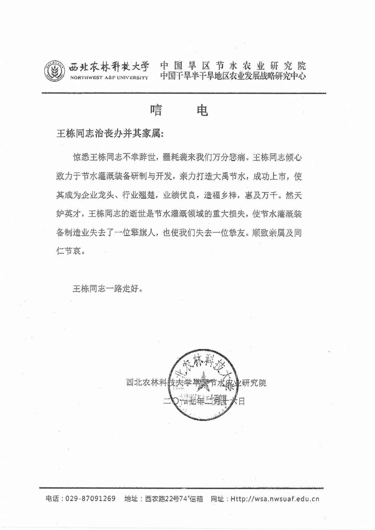 西北农林科技大学旱区节水农业研究院唁电