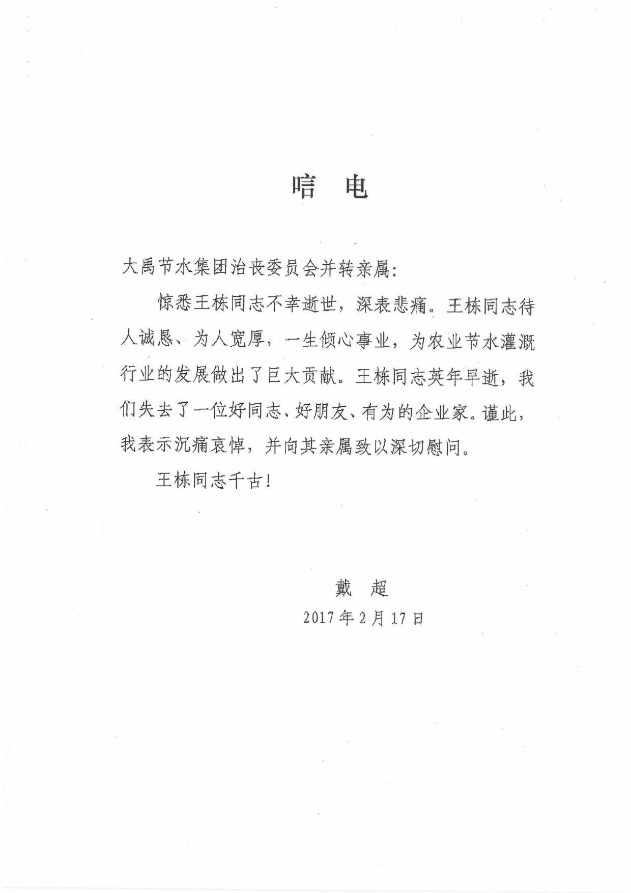 甘肃省生长和刷新委员会副主任戴超唁电