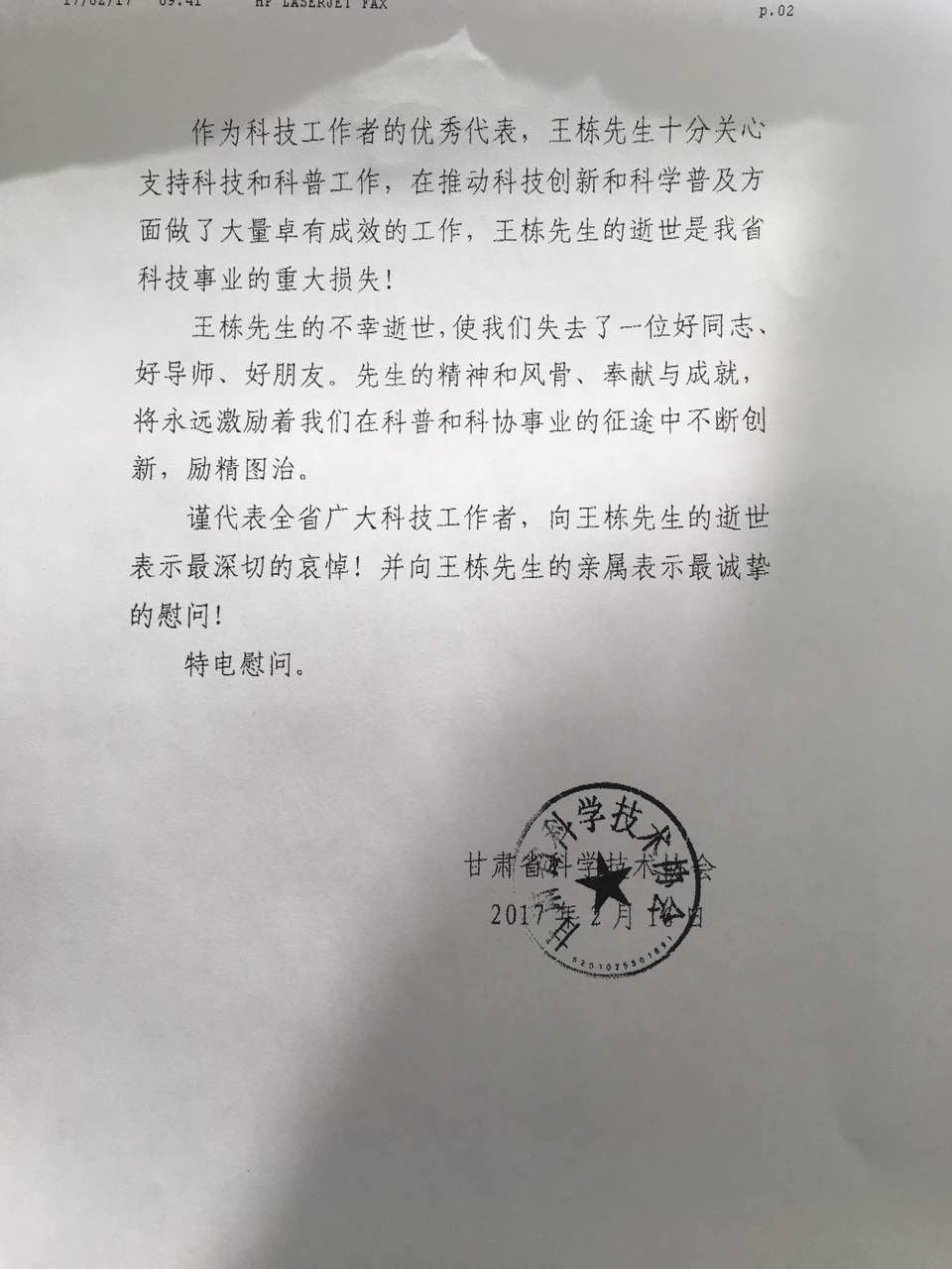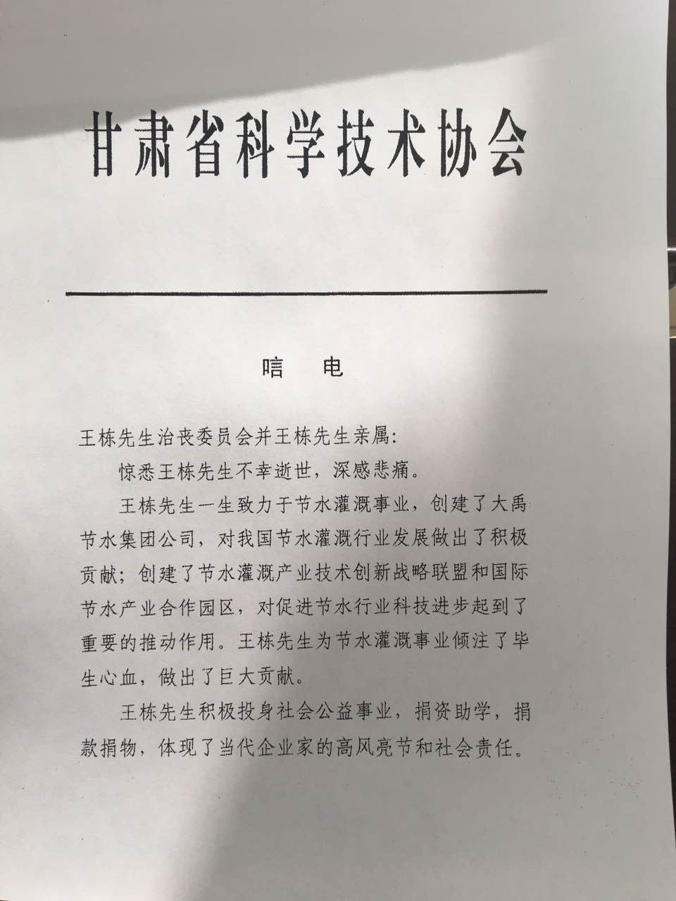 甘肃省科学手艺协会唁电