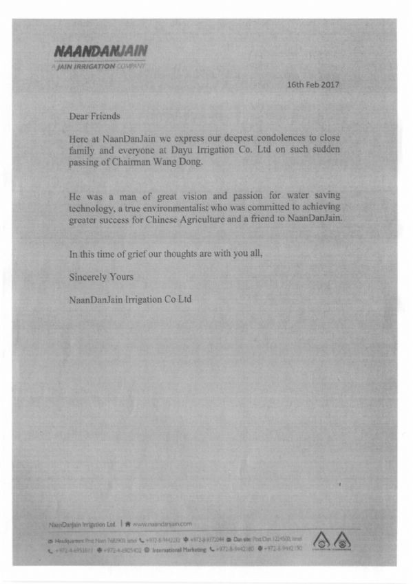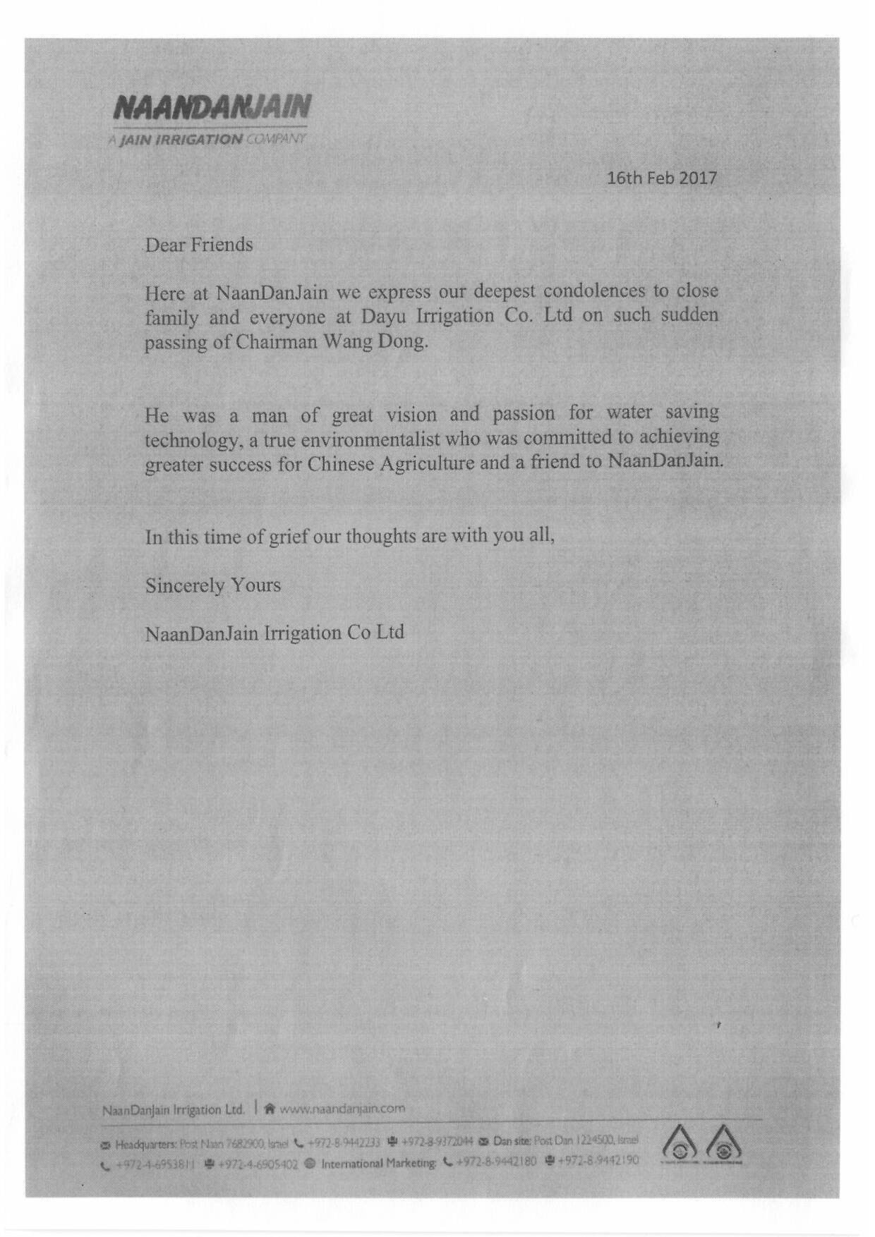 以色列纳安丹浇灌有限公司唁电