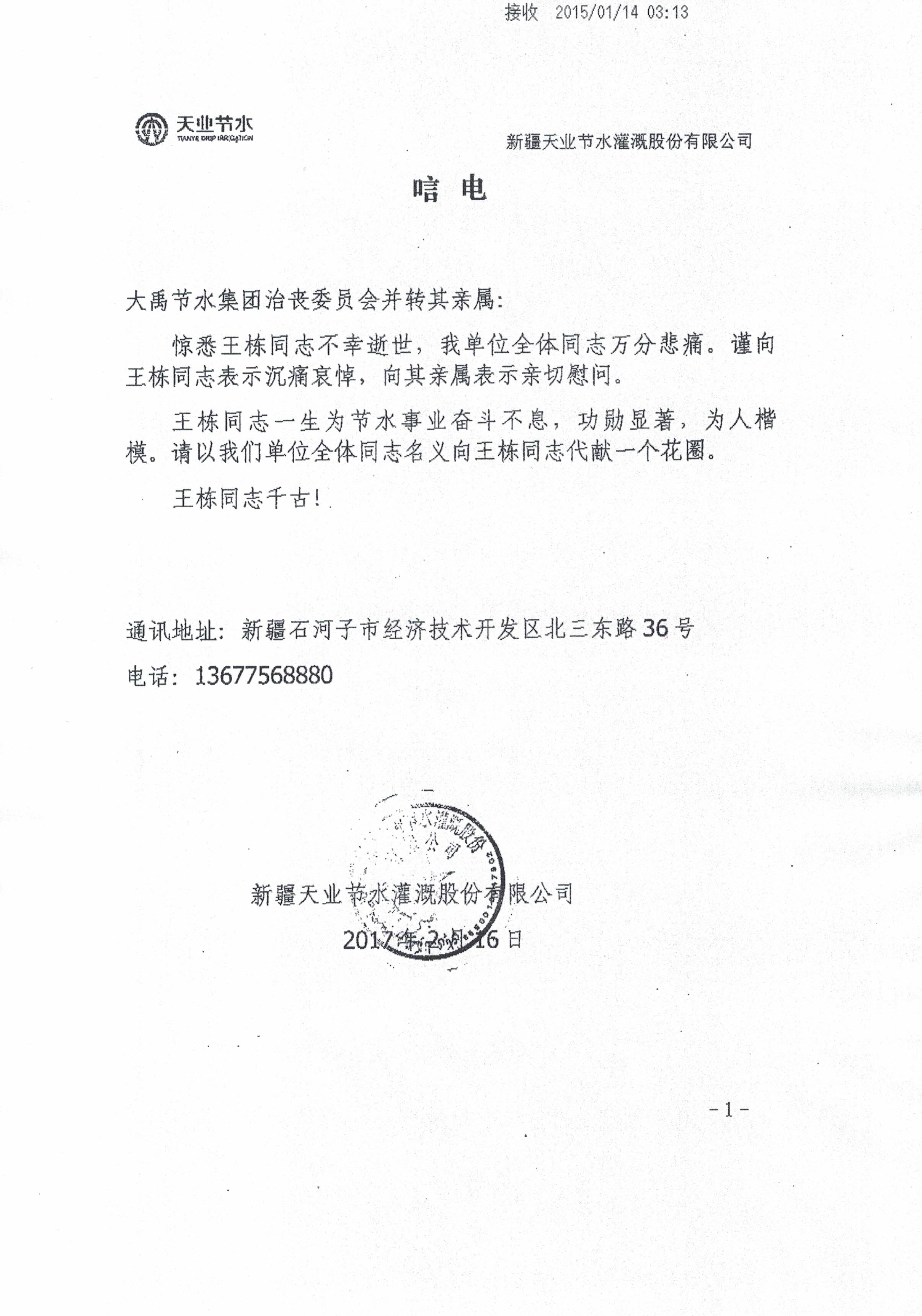 新疆天业节水浇灌股份有限公司唁电