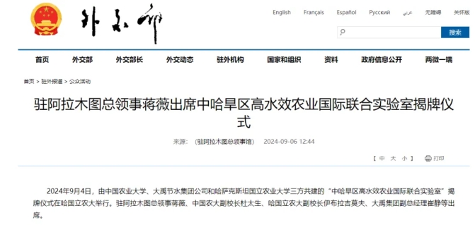 今年7月2日,在两国元首见证下,中国农业大学、哈萨克斯坦国立农业大学和九州酷游官网节水集团三方共建“中哈旱区高水效农业国际团结实验室”的协议入选两国合作清单。