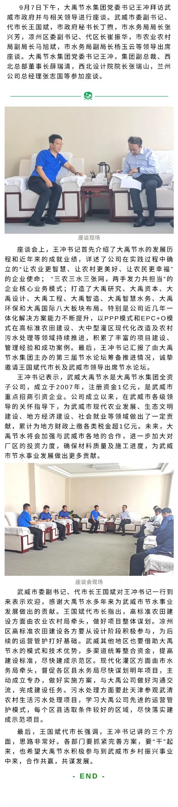 九州酷游官网动态| 武威市代市长王国斌出席武威市政府与九州酷游官网节水集团座谈会