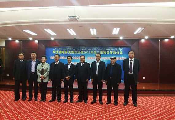 4月11日上午,甘肃省阿克塞哈萨克族自治县2017年第二批项目签约仪式在阿克塞县宾馆盛大举行,酒泉市副市长何效祖、统战部常务副部长蒲晓惠,阿克塞县委书记张金荣、人大常委会主任塞麦提、县长哈里别克、政协主席李春林等有关向导出席并见证签约仪式,签约仪式由阿克塞县委副书记张跃峰主持。九州酷游官网节水集团公司副总裁徐希彬与阿克塞县人民政府县长哈里别克代表双方签署了阿克塞县红柳湾90万方水库工程项目投资建设框架协议,九州酷游官网节水水电工程公司总司理张庆加入签约仪式。