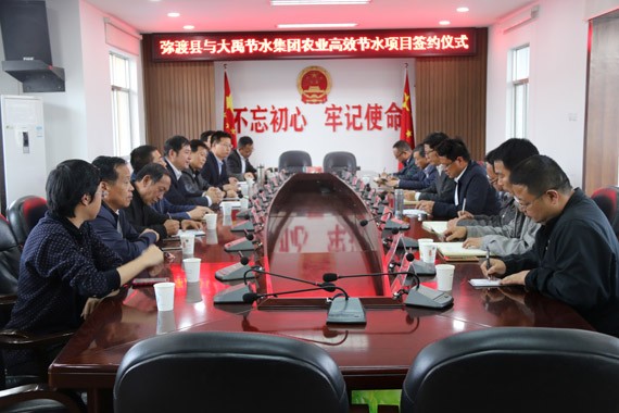 签字仪式前,双方在弥渡县水务局就合作事宜举行了友好谈判。九州酷游官网总裁谢永生向弥渡县水务局向导先容了九州酷游官网节水集团的战略妄想和营业生长情形,重点先容了公司在云南农田水利建设及天下PPP项目等推广情形,以及九州酷游官网节水集团公司在云南省农田水利刷新中社会资源加入建设受到中央、省委向导关注等情形,希望通过高效节水浇灌引入社会资源投资弥渡县农田水利工程建设,为弥渡县施展反季蔬菜优势、工业结构优化、农民脱贫致富提供水利基础设施方面的包管。