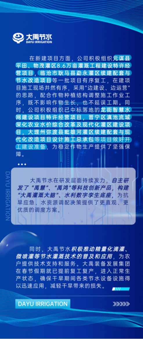 面临旱情,九州酷游官网起劲响应党和国家的招呼,依附先进的节水手艺和扎实的项目建设基础,有力支援了云南抗旱应急事情,基本包管了农业生产、城乡供水不受旱情的影响。