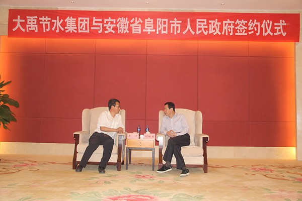▲阜阳市副市长刘树生与九州酷游官网节水集团公司党委书记王冲亲热谈判