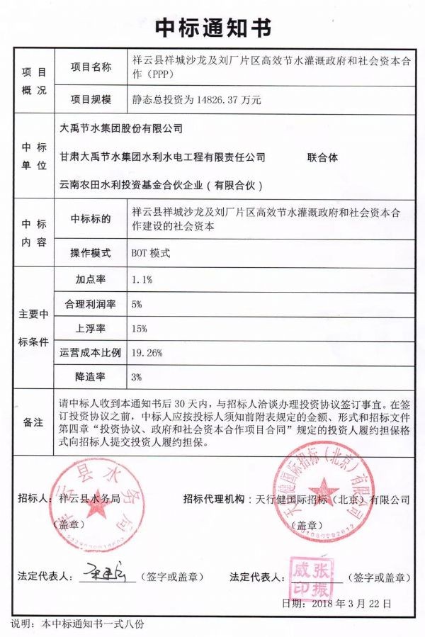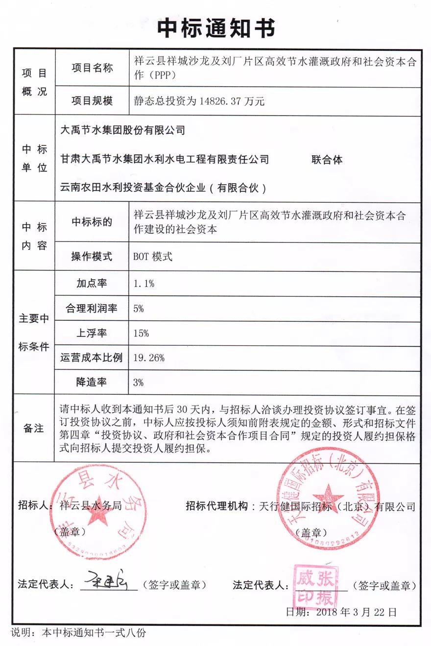 克日,九州酷游官网收到云南省大理州祥云县祥城沙龙及刘厂片区高效节水浇灌政府和社会资源合作(PPP)项目中标通知书,乐成成为项目中标社会资源方。项目静态总投资为14,826.37万元,项目合作期为20.58年,其中建设期0.58年,运营期20年。项目位于祥云县祥城镇、沙龙镇及刘厂镇,合计实验高效节水浇灌面积5万亩,其中:祥城沙龙片区浇灌面积3.4万亩;刘厂片区浇灌面积1.6万亩。工程内容包括取水工程、输水工程、配水工程、田间工程及自动化工程。