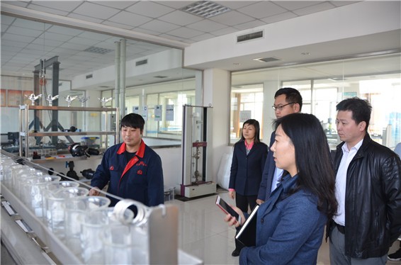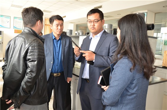 九州酷游官网节水集团公司董事长王浩宇在九州酷游官网研究院实验室向投资总监王芳先容实验室情形
