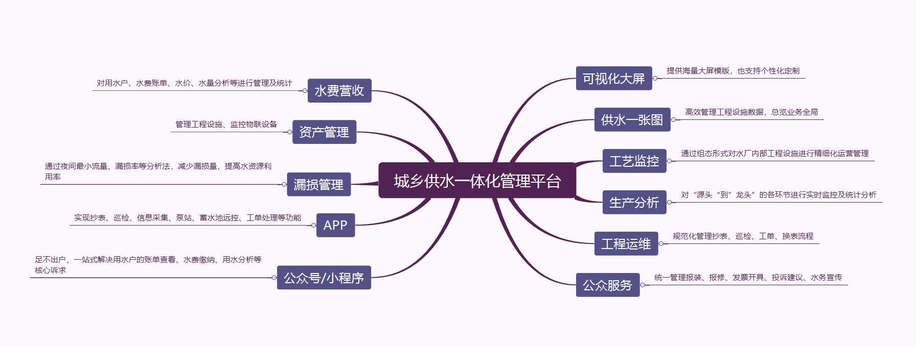 ͨ¹ýÐÂÒ»´úÐÅÏ¢ÊÖÒÕÓëË®ÀûÓªÒµÉî¶ÈÈںϣ¬ÊµÏÖ¹©Ë®ÏµÍ³µÄÊý¾Ý×ÊÔ´»¯¡¢¹ÜÀí׼ȷ»¯¡¢¾öÒéÖǻۻ¯¡£ÒÔÊý¾Ý¼ÝÊ»²ÕµÄ·½·¨Ö±¹Ûչʾ³ÇÏ繩ˮһÌ廯¹¤³ÌµÄÖÆË®¹¤ÒÕ¡¢Ë®Á¿¡¢Ë®ÖÊ¡¢Äܺġ¢¹©Ë®ÔËά¡¢ÊµÊ±±¨¾¯¡¢ÊÓÆµ¼à¿Ø¡¢Â©Ëðî¿Ïµ¡¢¹¤³ÌÂþÑܵÈÖ¸±êºÍÐÅÏ¢¡£´ËÄ£¿éÖ÷Òª°üÀ¨Ë®·ÑÓªÊÕÆÊÎö¡¢ÖÇ»ÛË®³§¼à¿Ø¡¢¹©Ë®¹¤³ÌϵͳÆÊÎö¡¢Éú²úµ÷ÀíÆÊÎöµÈ¡£