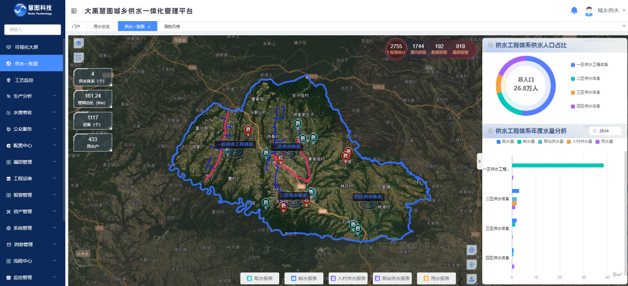 ͨ¹ýGISµØÍ¼µÄÐÎʽ£¬¶ÔËùÓÐˮԴ¡¢¹ÜÍø¡¢ÖÆË®Ë®³§¡¢¼Óѹ±ÃÕ¾¡¢ÐîË®³ØµÈ¹¤³ÌÊý¾ÝµÄµØÀíλÖÃÂþÑÜÐÅÏ¢¾ÙÐм¯ÖÐչʾ¡£Í¨¹ý¹©Ë®¹¤³Ìϵͳ×ÜÀÀͼºÍ¹¤³ÌÉèÊ©ÂþÑÜͼµÄÍŽᣬʵÏÖ´Óºê¹Ûµ½Î¢¹ÛµÄ×êÈ¡¡£ÔËÓª¹«Ë¾¿Éƾ֤²î±ðµÄ¹¤³ÌÉèÊ©ÀàÐÍÉó²éÏìÓ¦µÄÉèʩװ±¸ÐÅÏ¢ºÍʵʱ¼à²âÊý¾Ý¡£