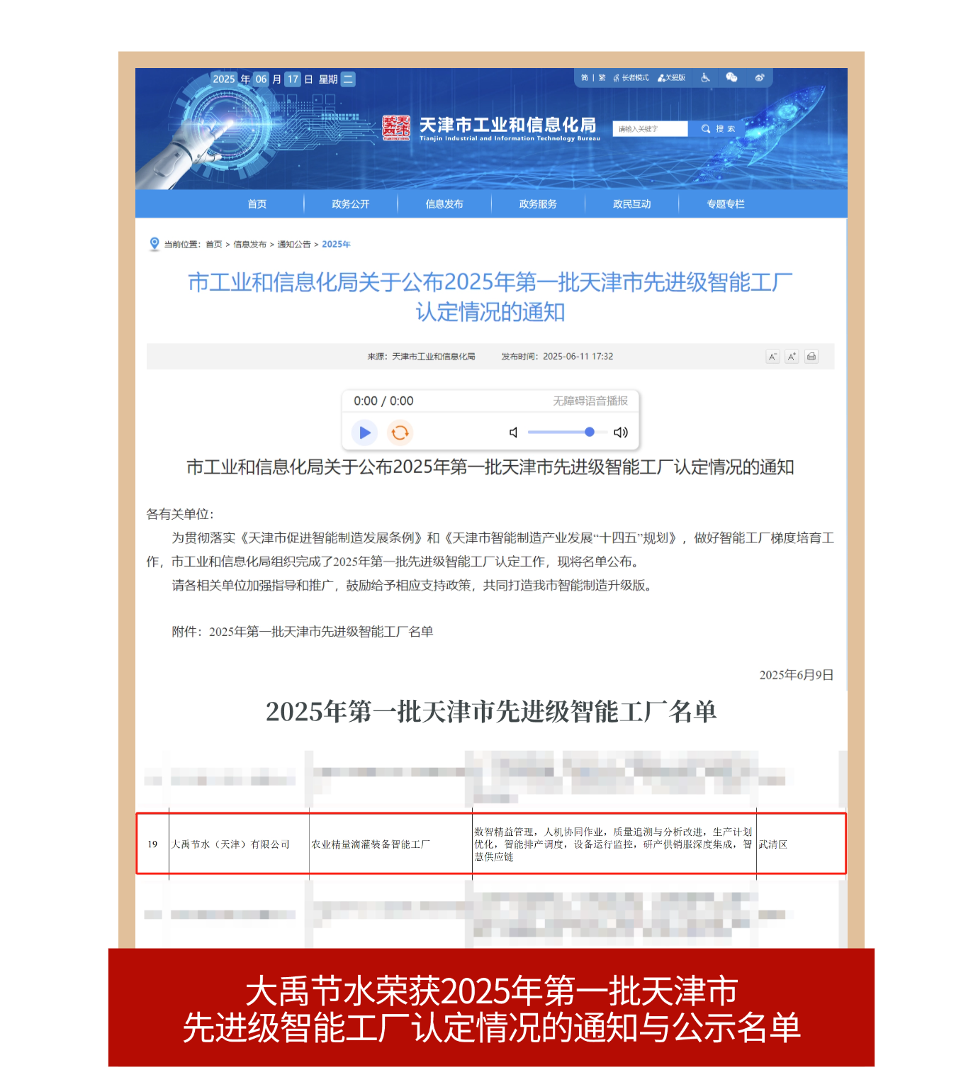 克日,天津市工业和信息化局正式宣布2025年第一批天津市先升级智能工厂认定情形,九州酷游官网节水(天津)有限公司申报的《农业精量滴灌装备智能工厂》项目,一举斩获此项殊荣。这一声誉不但彰显了九州酷游官网节水在智能化生产、管理立异等方面的综合实力,更激励着全体九州酷游官网人以越发饱满的热情在农业智能装备的赛道上勇猛前行。